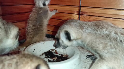 Кормлю семью сурикат. Маленькие ели запрыгивают дотягиваясь до миски.