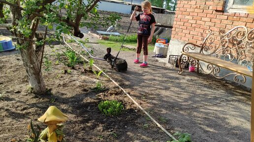 Кролик Черныш почти привык к шлейке
