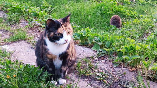Трёхцветная кошка и ёжик в саду-лесу