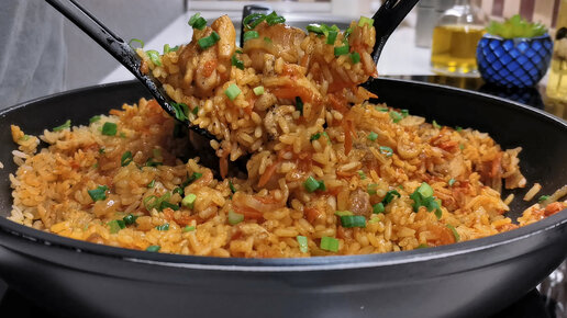 Ужин - объедение из курицы и риса на одной сковороде. Быстрый плов в восточно-азиатском стиле на скорую руку