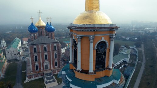 Невероятная красота Рязанского кремля: дрон снимает колокольню Успенского собора со всех сторон в осеннем тумане