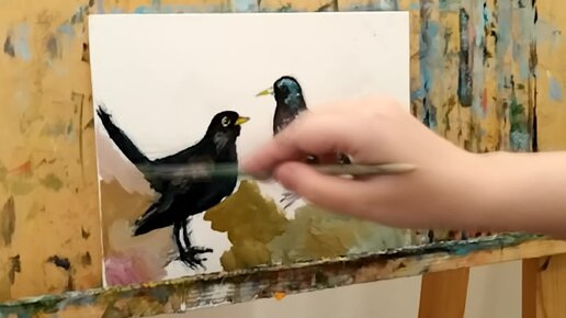 Отличие черного дрозда и скворца - картина маслом поэтапно