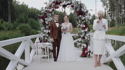 Романтичная свадьба с бело-бардовым декором, выездной церемонией у воды, съемкой с коптера и шикарным окончанием дня