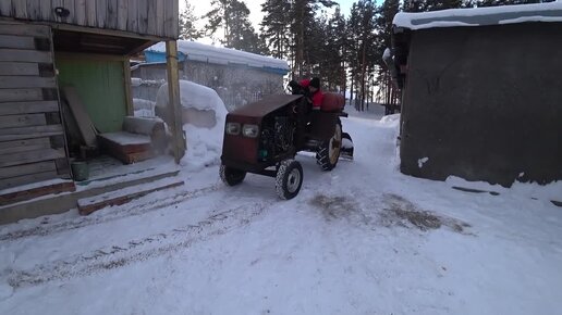 Холодный пуск самодельного трактора ,чистим снег.