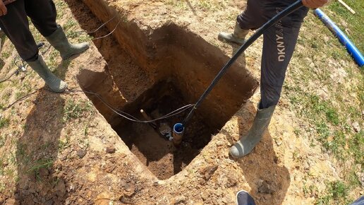 Опускаем насос в скважину перед монтажом кессона
