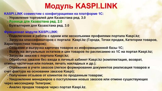 Функционал модуля KASPI.LINK для интеграции интернет-магазина Kaspi.kz и 1С:Предприятие 8.3.