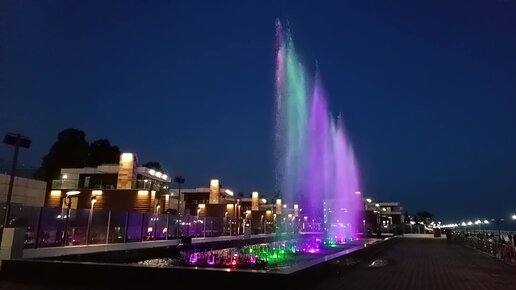 ФТ Сириус (Сочи), светомузыкальный фонтан на Имеретинской набережной у парк-отеля "Арфа", субботний вечер в конце мая 2023.