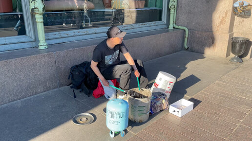 Барабанить можно на чем угодно – парень мастерски играет на ведрах и других подручных инструментах, прирожденный барабанщик