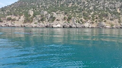Стая дельфинов вдоль скал Нового Свете плывёт себе в сторону мыса Меганом