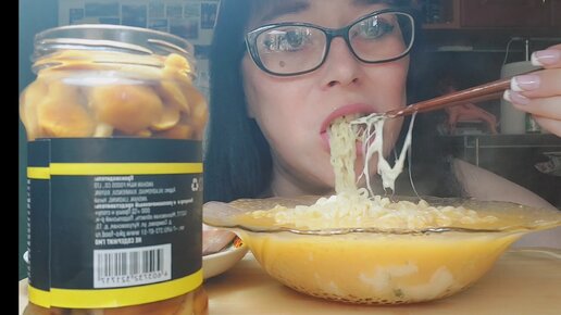 Мукбанг | Сырный рамён с пармезаном,маринованные опята и русская колбаса😋. Обжорчик