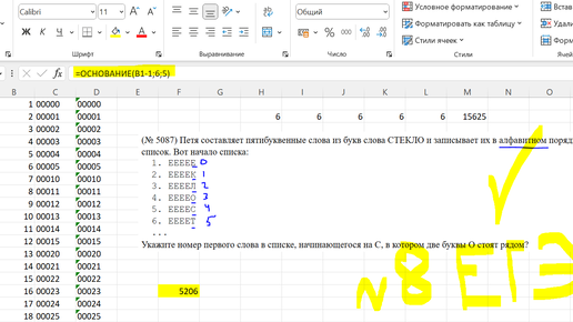ЕГЭ, задание № 8, информатика в ЭТ. Решаем задачу на комбинаторику старого типа про слова и буквы в Excel с помощью функции =основание()