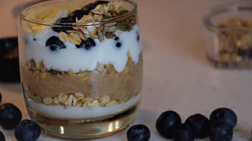 Полезный завтрак! Готовим энергетический стаканчик с греческим йогуртом, гранолой, бананом и голубикой! Идеи для завтрака