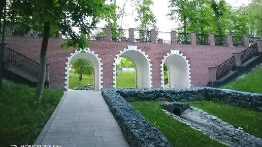 Необычный мостик и каменные ограждения в парке где усадьба и жилые дома. Поселок Петровское. Москва