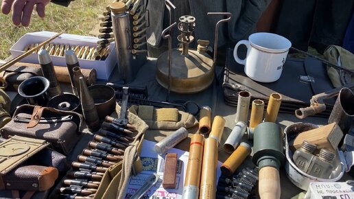 Мужчина на барахолке продает вещи времен войны наши и немецкие, показываю что по чем