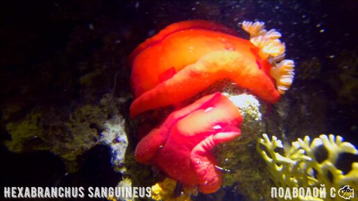 Крупный танцор распластавшись ползет по дну, хорошо видны жабры.