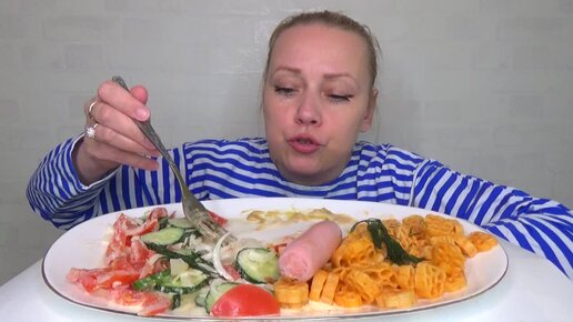 Мукбанг макароны с сосисками, салат овощной! Давно не ела сосиски, соскучилась.