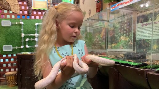 Ребёнок держит змею. В контактном зоопарке. Видео из семейного архива