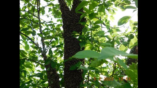 Снятие роя со ствола черёмухи.