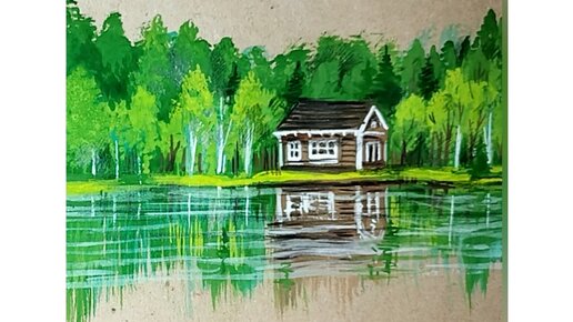 🏡🌊Домик на том берегу реки. Рисунок гуашью на крафтовой бумаге.🌿🏡🌿