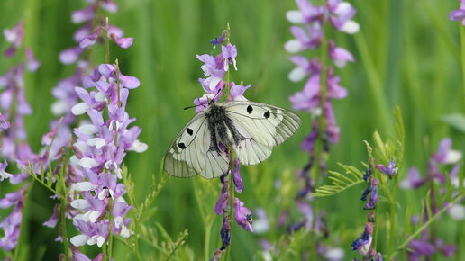 Бабочка-парусник Мнемозина порхает и ест нектар