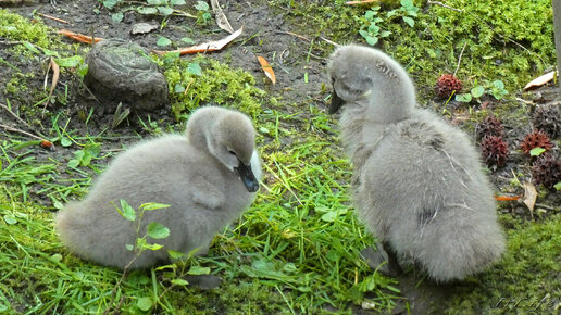 Черные лебеди! Угостили свежей травкой! Птенцы с удовольствием лакомятся подарком! Сочи. Дендрарий.