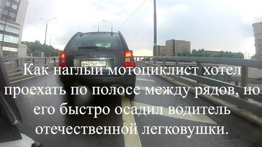 Как наглый мотоциклист хотел проехать по полосе между рядов, но его быстро осадил водитель отечественной легковушки.