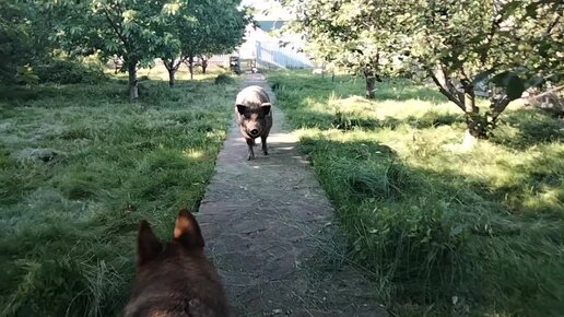 Хрюня тоже вышла посмотреть что там теперь в саду