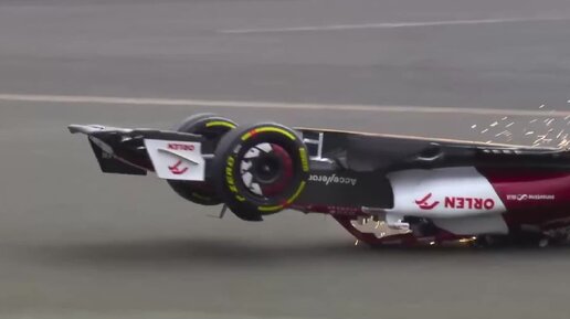 Страшная авария в Формуле-1. Перевернутый болид несется к барьерам.