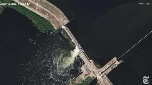Вид со спутника на Каховскую ГЭС до и после разрушения