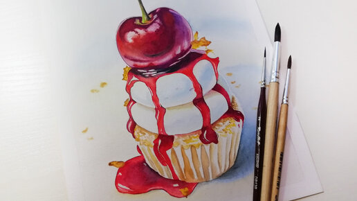 🧁Пирожное с вишней АКВАРЕЛЬЮ // Cherry cake with WATERCOLOR🧁
