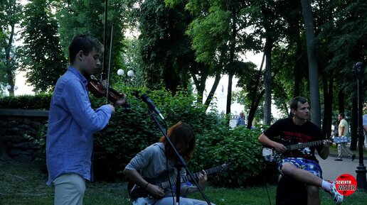 Мастера импровизации!! Трио молодых музыкантов импровизируют на улице. Молодые поклонницы засмотрелись на молодых парней!!