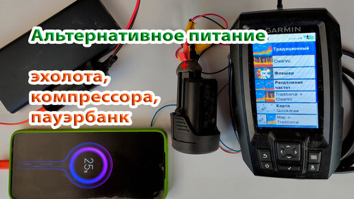 Аккумулятор от шуруповерта для эхолота. Пауэрбанк из него же. И компрессор от него же запитал.