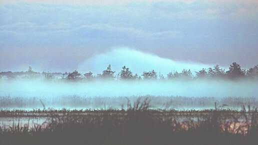 Горы тумана на рассвете наползают с болот