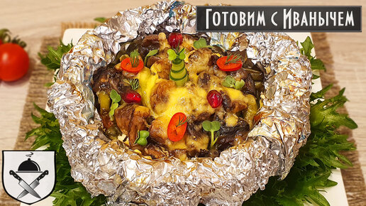 Мясо запеченное с грибами и овощами в мешочках из фольги