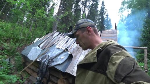 Добрались до участка в тайге. Прячемся от грозы и шторма в сгоревшей заячей избе. Убираем территорию, готовим большой стейк с овощами.