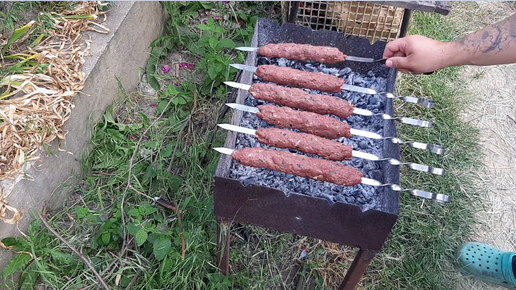 Люля-кебаб из баранины и говядины на углях с соусом из томатов и гарниром из кабачков-гриль