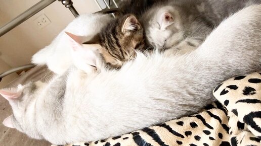 Как кошка Кайли выкармливала и воспитывала свою приёмную дочь малютку Кристалл вместе со своими котятами.