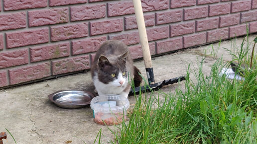 Бездомная кошка испугалась голодного кота и уступила ему миску с едой. Накормили серого кота кормом для кошек, а кошка наблюдает за ним