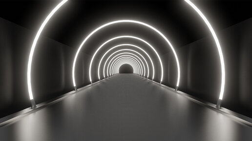 Неоновый туннель из белых арок на темном фоне. Отражающий пол. Цикличное видео. Футаж