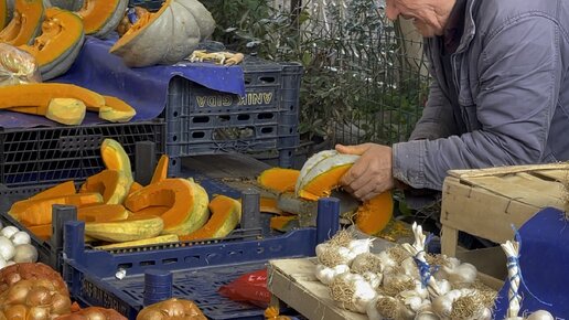 Продавец-стамбулец режет тыкву пилой на рынке в Кузгунчук