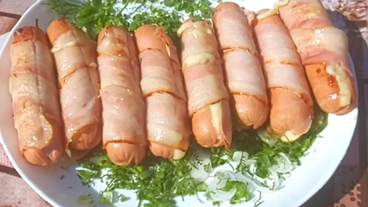 Шашлык барбекю из сосисок с сыром в беконе.