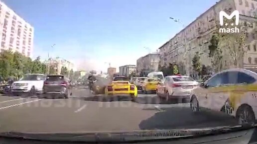 Момент возгорания жёлтой Lamborghini Gallardo на Смоленском бульваре в Москве