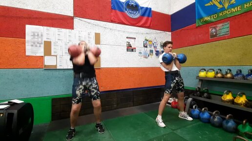 Интервальная тренировка: Толчок гирь 18кг и 20кг. Пастухов Т. и Шкаликов Сергей.