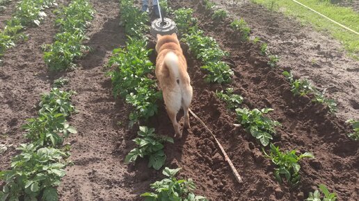 Окучивание картошки под четким контролем собакена)