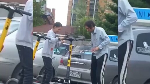Пьяный джентельмен взял для своей нетрезвой леди в аренду электросамокат в Красноярске, а та, еле стоя на ногах, врезалась на нем в машину.