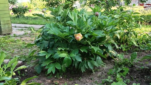 Начало роспуска пиона " Бартзелла " ,спрятавшиеся розы🌹, как грибы 🍄 в лесу. Цветущие ирисы. Сад.