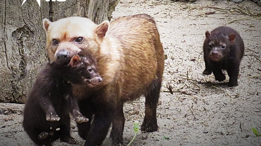 Щенки кустарниковых собак не дают покоя маме
