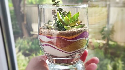 Флорариум из суккулентов в бокале с цветным песком своими руками