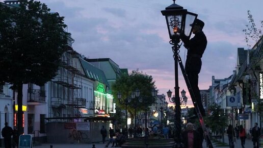 Аптека, улица, фонарь. Зажжение фонарей в Бресте "по-старинке" знаменитым фонарщиком. Совесткая улица, Брест, Беларусь.