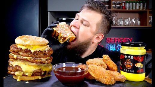 БОЛЬШОЙ БУРГЕР И ХРУСТЯЩИЕ КРЫЛЫШКИ, ASMR MUKBANG, АСМР МУКБАНГ, 먹방, 大食い, たべる, 谢尔盖